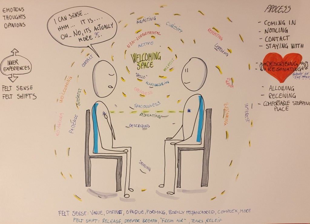 This also makes me think that there is one thing that often is missing, and that I can’t really explain, but that is what I have only found in Focusing so far: and that is that when we do this practice that I often call “Felt Sensing”, we don’t turn towards finished packages of emotions, feelings, memories, images and underlying felt somethings that are unchangeable. Only to then sort of change our “attitude” towards what is immovably and unchangeably there.