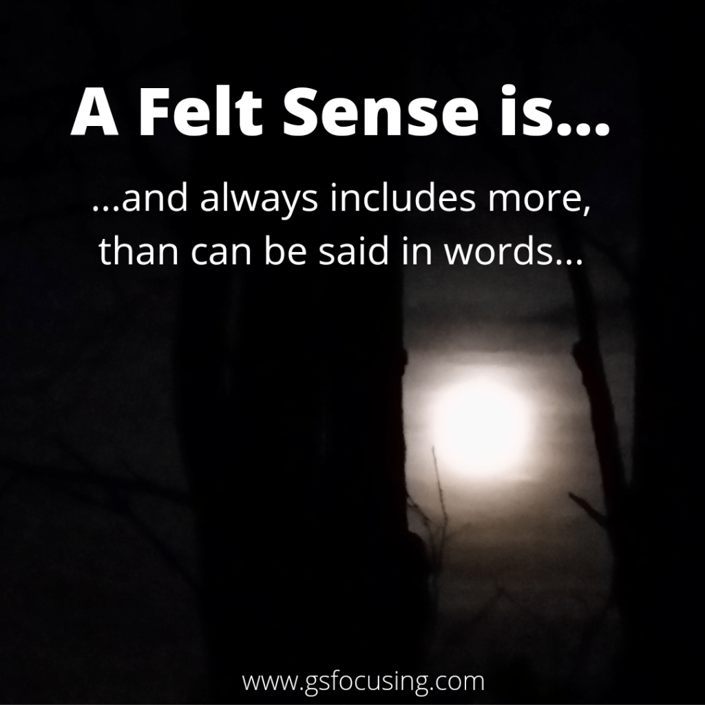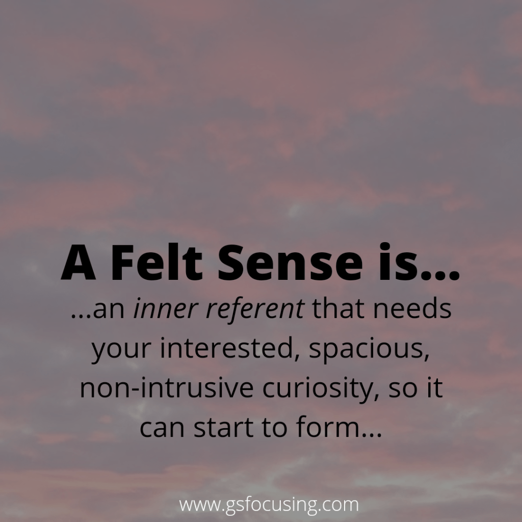 The Felt Sense is vague, murky, unclear, initially wordless and nameless, yet clearly there in a bodily way if we invite it to form. It will disappear as soon as we judge, analyse or try to be logical about ut too soon. If we pause and sit next to it with open, active, non-intrusive, non-judgemental curiosity, it will open up and come, with surprise and deeply felt meaning.