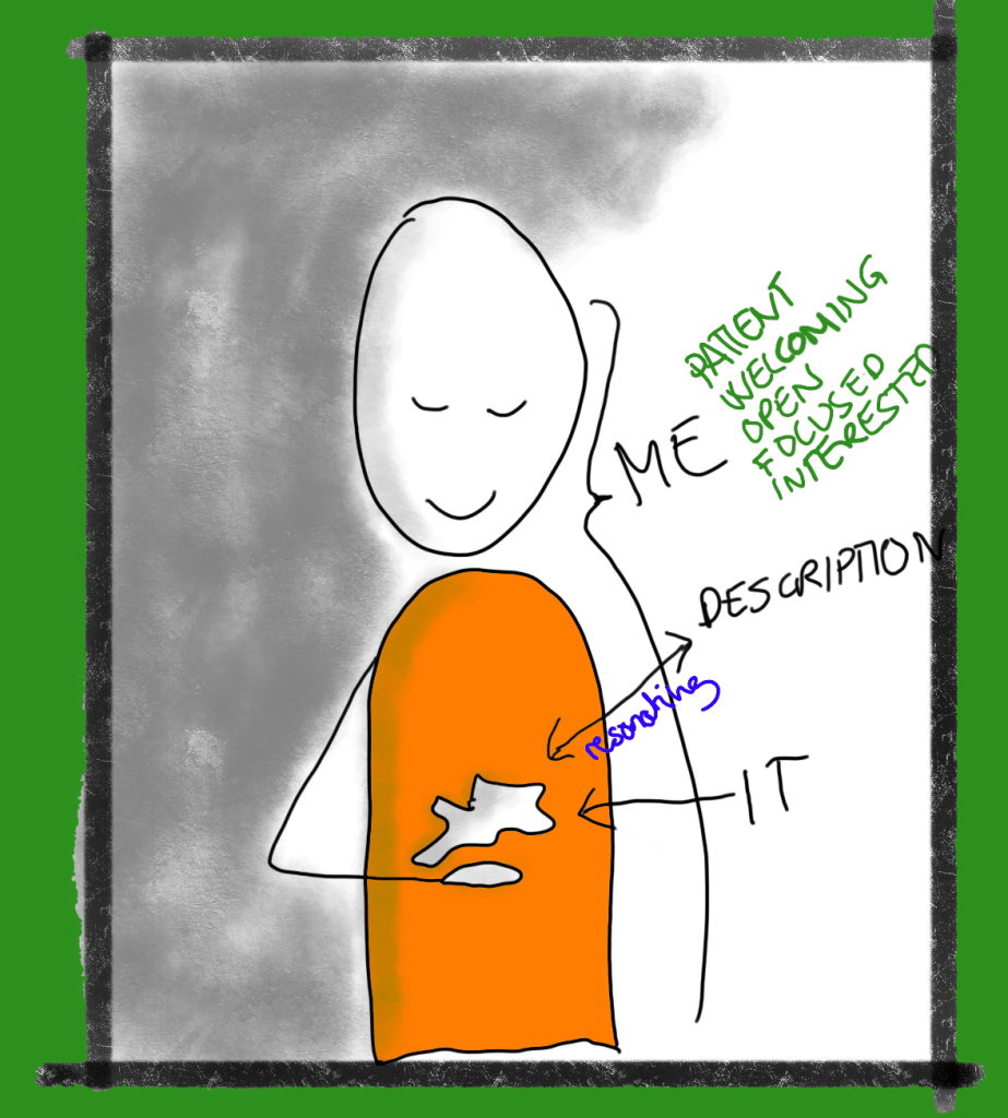 The resonating and slowness are at the core here – there is (a) “me”, there is (b) the “it” (emotion or whatever it is”), and there is (c) what it is “called”. And I check with it if the word FITS FOR IT. I am allowing the process, the “body”, my inner knowing to let me know what or who it really is or feels.